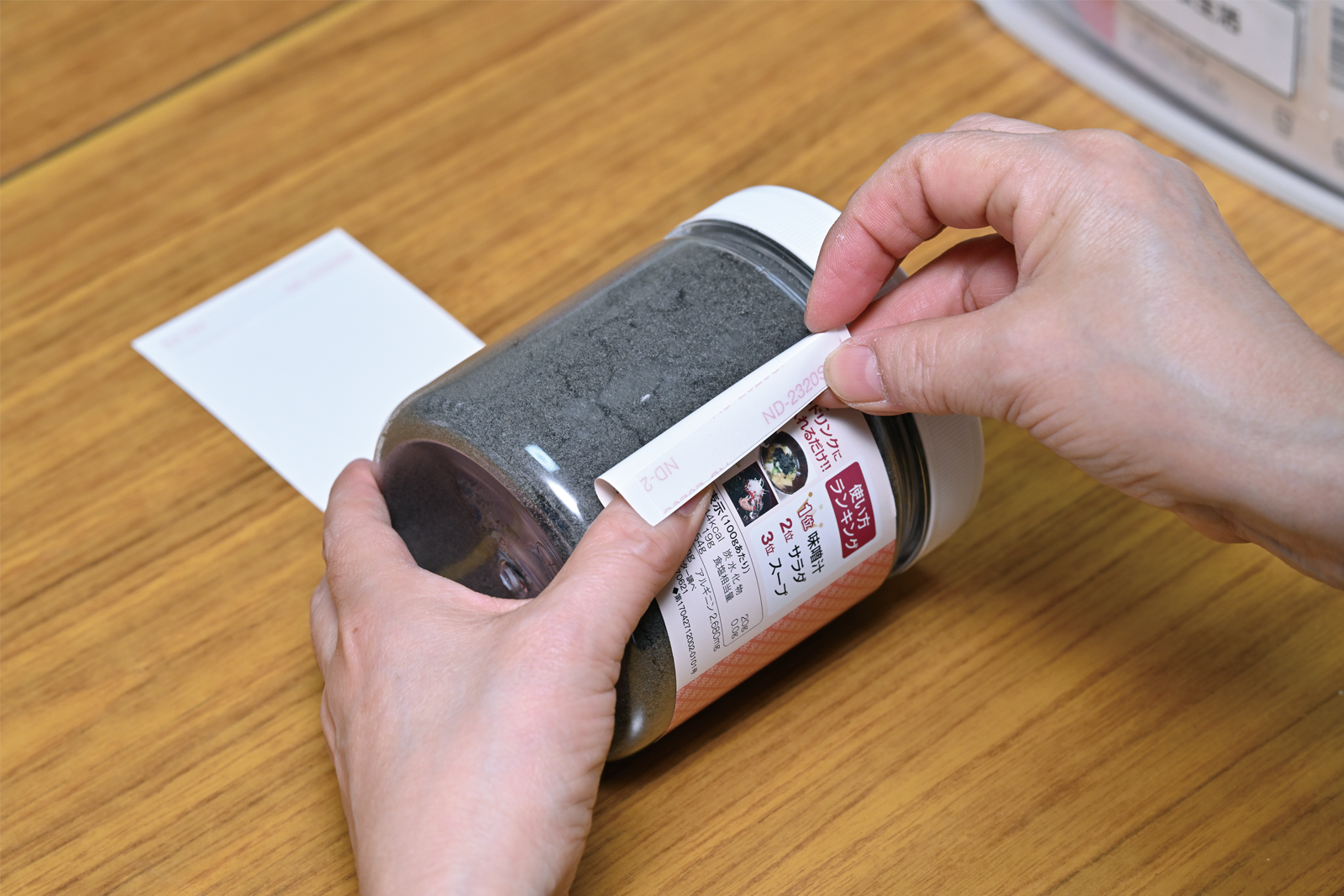 ごまを杵と臼で搗き、ふりかけなどへの加工を行います。袋への充填作業やラベル貼り、ラッピングして商品として完成させます。