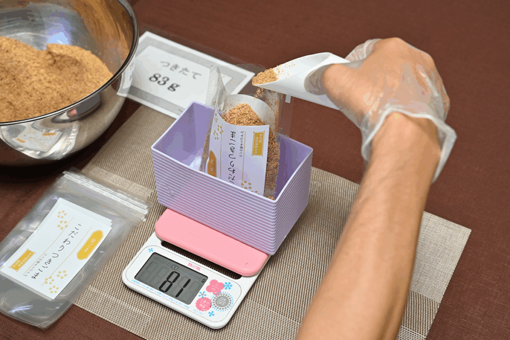 ロンの家のごま商品の袋詰、ラベル貼りなどはすべて手作業で行っています。軽量なども丁寧に行い、検品も厳しく行います。他にも、大手企業や自治体等の作業を請け負っている実績があります。