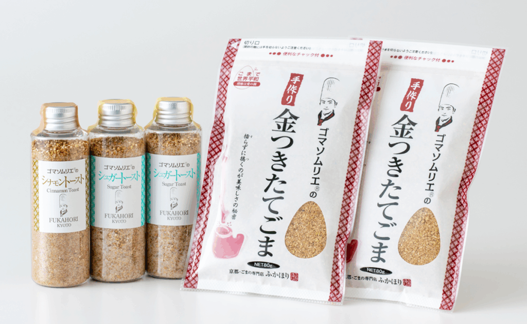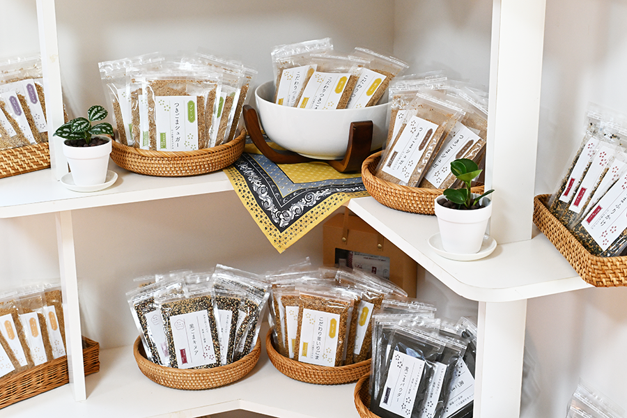 お料理に使いやすい「つきごま」はもちろん、各種「ふりかけ」や「ごまシュガー」など種類も豊富。おしゃれなオリジナルパッケージで贈答品にもぴったり。3名のラッピングコーディネーターが、手に取る人を思いながら、素敵なギフトに仕上げます。